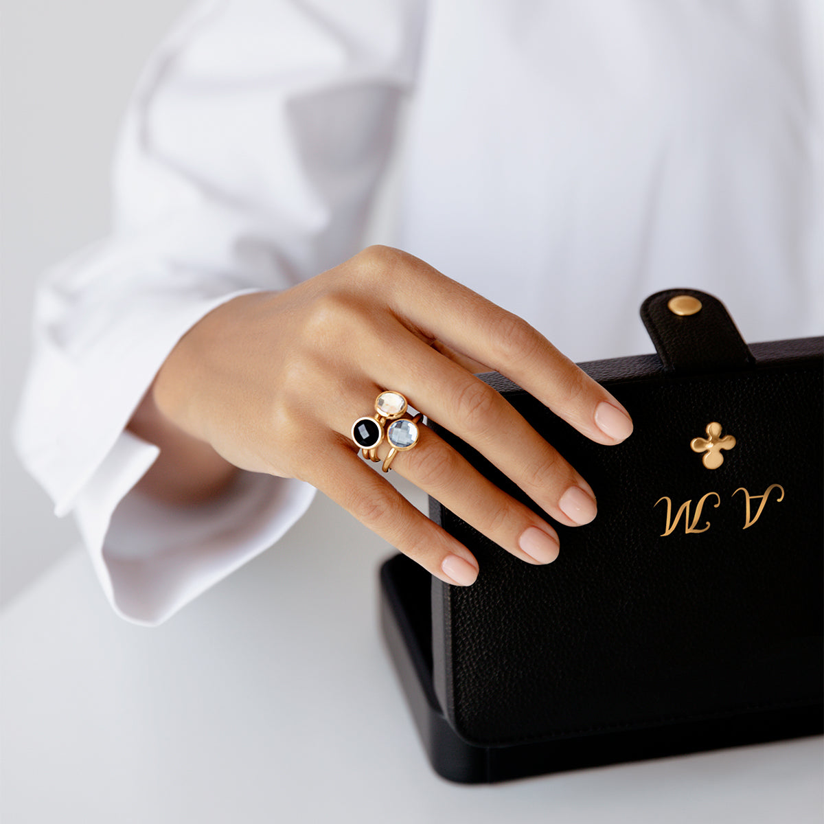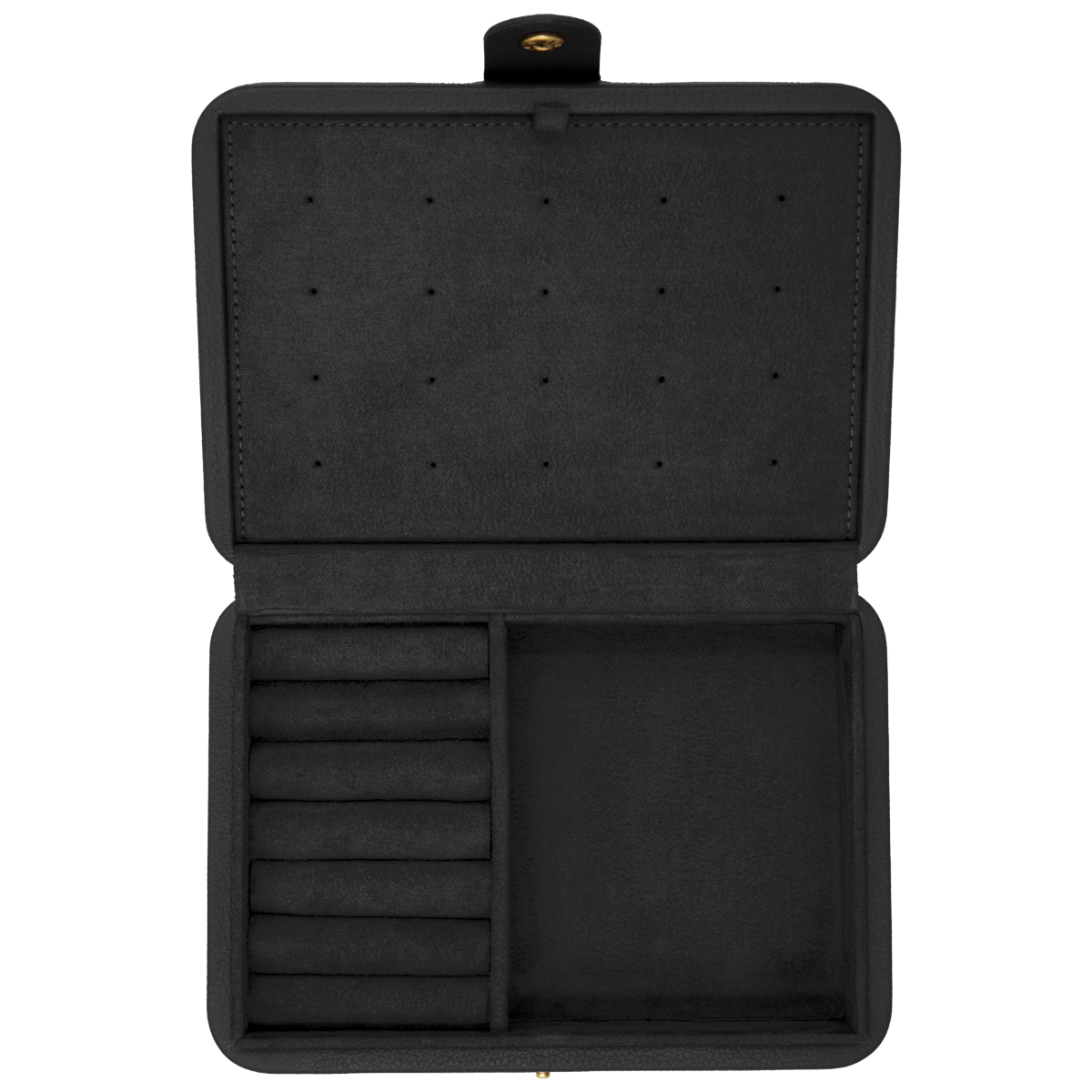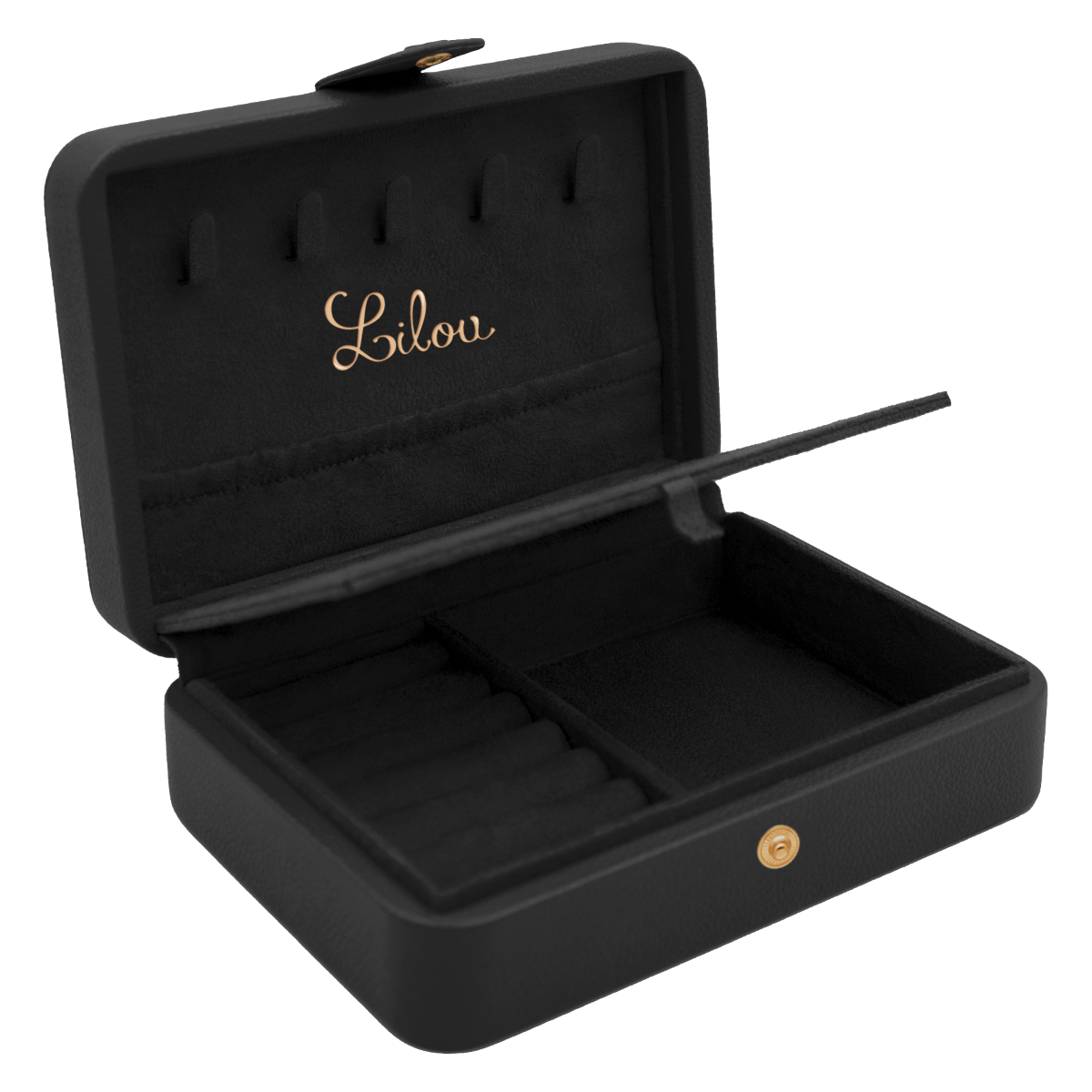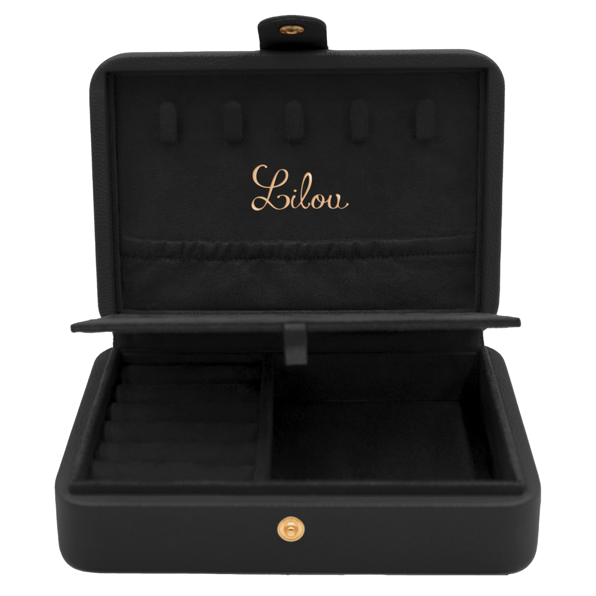 Black jewelry box with a black velvet lining. Crafted from high-quality Italian leather. The box has two internal compartments, separated...... Read more
