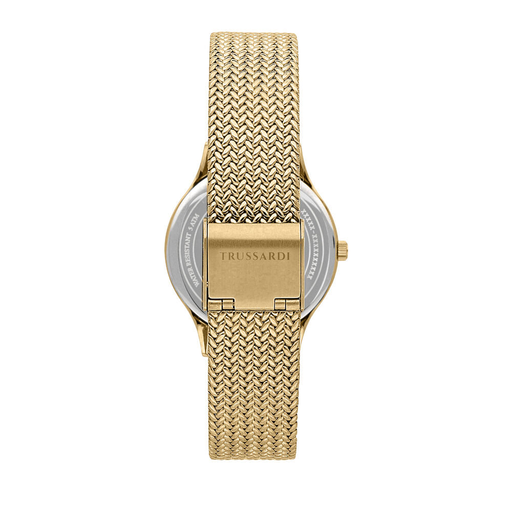 The Trussardi watch from the T-STAR collection, women's model, is an elegant and refined accessory. With a brushed and polished stainless steel case, this watch impresses with its simplicity and elegance. The white dial gives the watch a classic and sophisticated look, while the mineral crystal offers protection against scratches. The golden metal bracelet complements the luxurious appearance of the watch, and the clip buckle ensures a secure and comfortable fit. Water-resistant up to 5 ATM, this watch is suitable for daily use and a variety of occasions. Made of steel and PVD gold, this Trussardi watch exudes elegance and style in any context. Case size: 34 mm